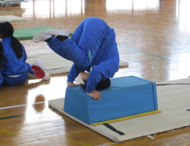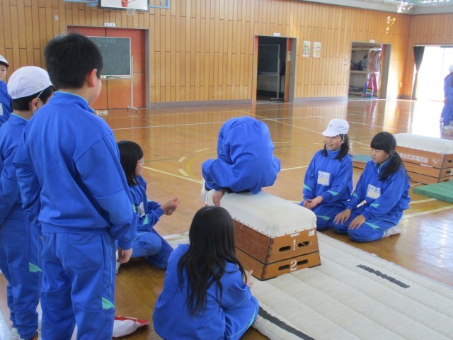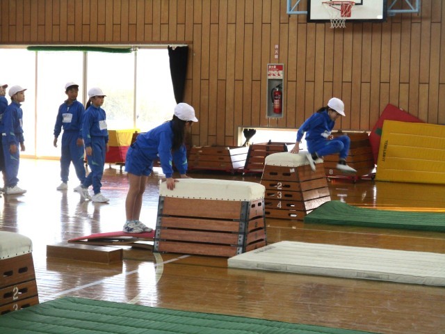 台上前転、開脚跳び、閉脚跳びなど、学習したことをもとにそれぞれ技の練習です。