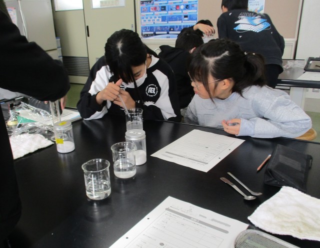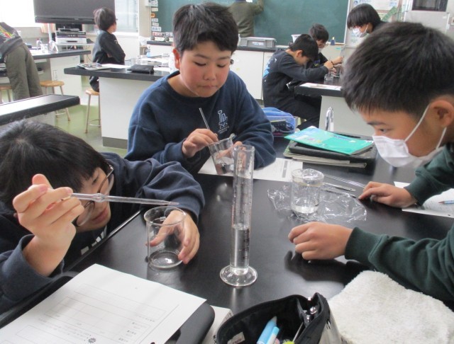 正確な結果を導き出すために、すり切り1杯や50mlの計測も慎重に行う子どもたち。