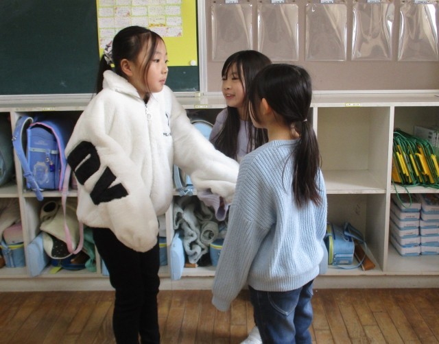 久しぶりに会った友達と笑顔で会話を楽しむ3年生。