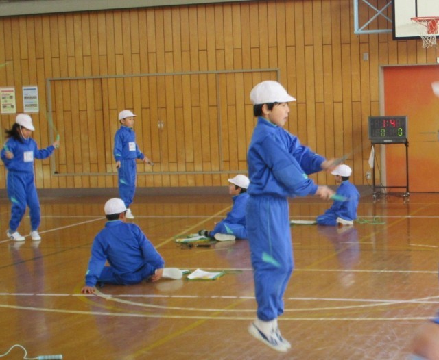 お互いに励まし、回数を数え合いながら、記録更新に向けて一生懸命練習中の4年生。