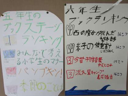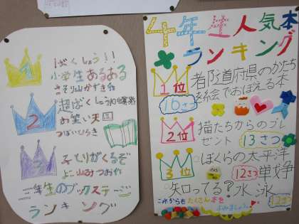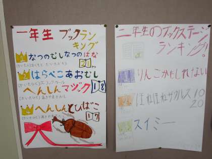 1学期に多く読まれた本のランキングは、学年別でも掲示されています。それぞれの学年によって、特徴が違いますね。授業の内容や学年ごとの流行などが反映されているようです。