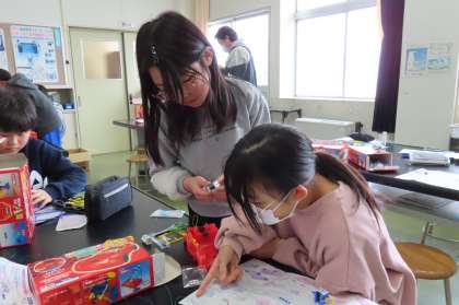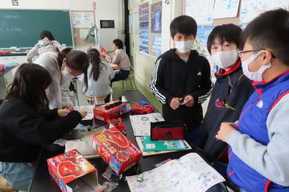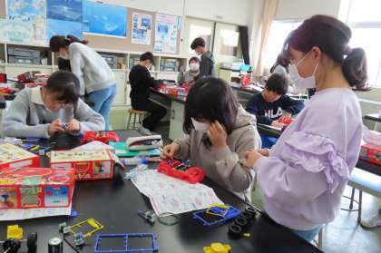 前の時間にコイルモーターを作って、モーターの仕組みについて学習した5年生。今日はいよいよ模型の自動車を動かすためのモーターづくりに入りました。説明書の通りに作業を進めていけばいいのだけれど、これが難しい。小さいころにこういう遊びが大好きだった私にとっては、ワクワクするうらやましい学習です。苦労しながらも、友達同士で情報交換しながら協力して取り組んでいました。