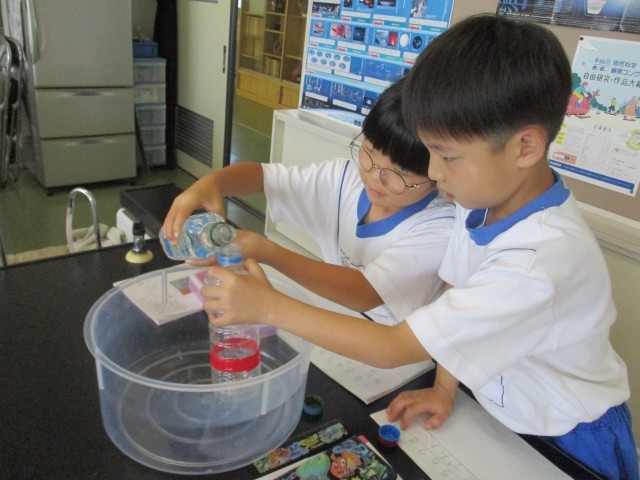 赤と青の容器では、どっちが多く水が入る?水のかさ比べが始まりました。ペットボトル...