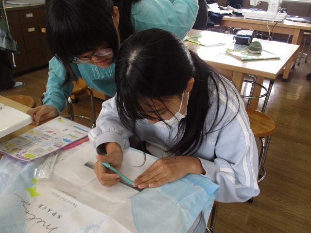 エプロンの最後の工程は、ポケットつけ。縫い代に印をつけ、アイロンで折り目をつけた...