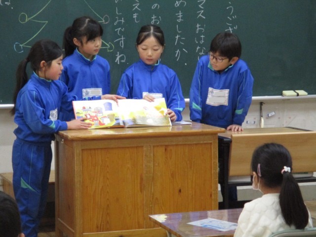 3年生が1年生教室に読み聞かせ訪問。1年生に興味をもってもらえる本を話し合って選...