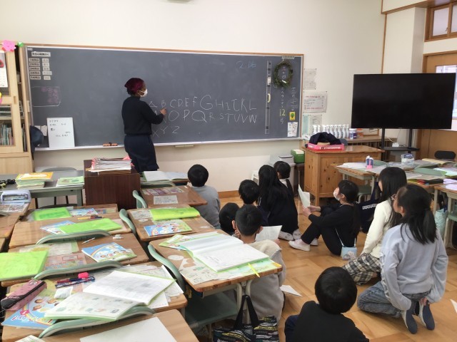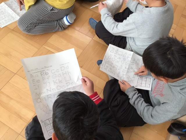 今回のロクサン先生との授業はアルファベットの勉強です。プリントを指さしながら、ロクサン先生と一緒に発音し、アルファベットを振り返りました。その後は、黒板を使ったアルファベットリレーです!1人1人順番に書いていく事で発音だけでなく、書く力も楽しく身につけていました!