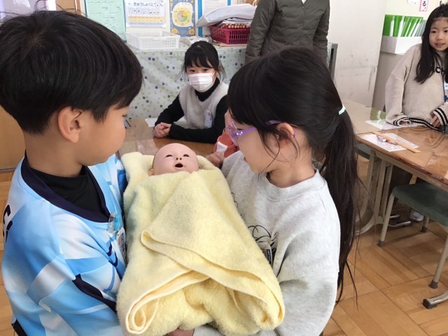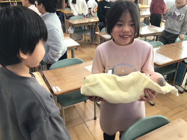 子どもたちは、生まれたときのあかちゃんの体重のお人形をだっこさせてもらうと、「思ったよりも重い!」「首がぐらぐらするね…」「わたしたちもこんな感じだったのかな…」と、話していました。