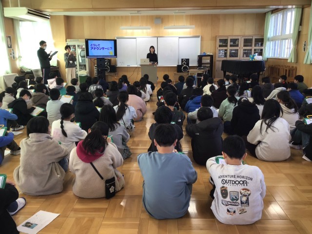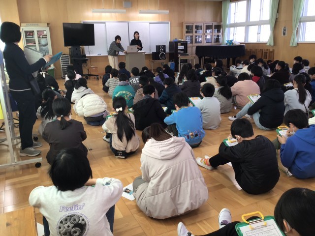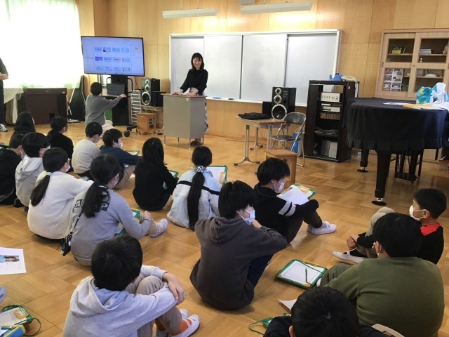 2月4日(水)、社会科情報の学習で出前授業を行いました。今回はKFB福島放送のアナウンサー 山崎聡子さんをお招きしました。授業では、アナウンサーの一日のスケジュールや、一つの番組ができるまでの過程を、貴重な映像を交えてお話いただきました。教科書だけでは学べない「現場の生の声」に、子ども達は興味津々で聞き入っていました。学区内にある放送局ということもあり、子ども達にとって身近な存在であるプロの方から直接お話を伺えたことは、大変貴重な経験となりました。本日の学びの様子は明日2月5日(木)午後3時48分放送の「超県民参加型テレビ シェア」の中で紹介してくださるそうです。ぜひご覧になってください。