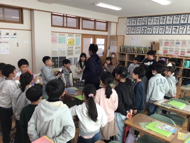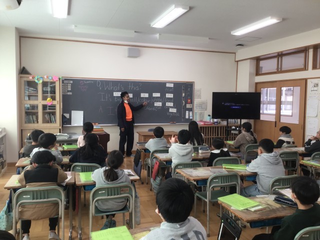 色や形などをヒントとして出し、かくされたものが何かを当てるクイズをしていきます。クイズをしながら繰り返し話す事で、楽しそうに英語の表現を勉強していました!