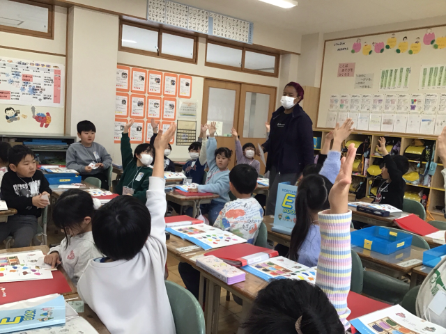 2月24日(火)は、はじめてロクサン先生と英語の授業をしました。みんなで手を繋いで英語の歌を歌ったり、好きな色や好きな動物でビンゴゲームをしたりして、楽しみました。6つビンゴが揃った児童もいました。次のロクサン先生の授業も楽しみです♪