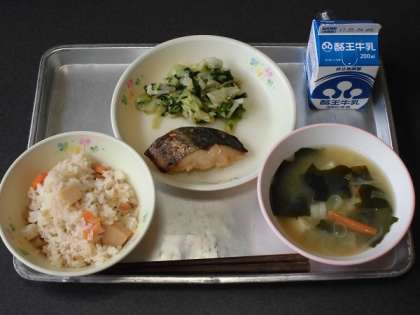 竹の子ごはん、牛乳、さわらのねぎみそ焼き、