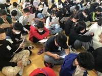 その2 ガラスのような黒曜石の石器を使って、鶏肉を切ってみました。今の包丁と同じようにスパスパと切れました。
