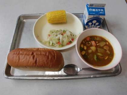 黒糖パン、牛乳、夏野菜と大豆のカレー煮、