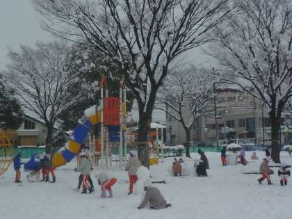 今日は、体育の時間に大島西公園で雪遊びをしました。子どもたちは、子犬のように公園を駆け回って、雪だるまを作ったり、雪合戦をしたりと、いろいろな遊びをして楽しむことができました。