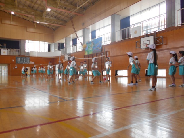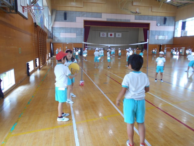 体育の時間、8チームに分かれて、ソフトバレーボールのゲームをしました。友だちと協力して、ボールを相手コートにかえすことができました。また、ボールを触っていない友だちに「どうぞ。」とボールをわたす姿も見られました。