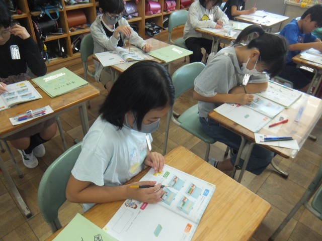 外国語の時間、さまざまな文房具の英語の言い方を練習しました。子どもたちは、「pencil」「eraser」「marker」など熱心に声に出していました。複数あるときには、“s”をつけることも覚えました。