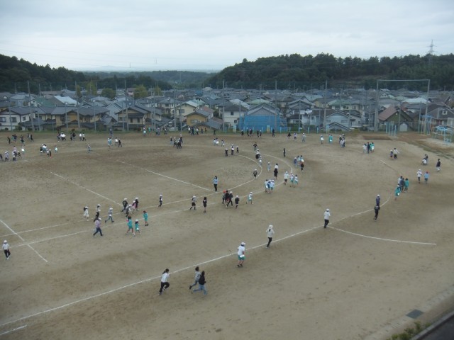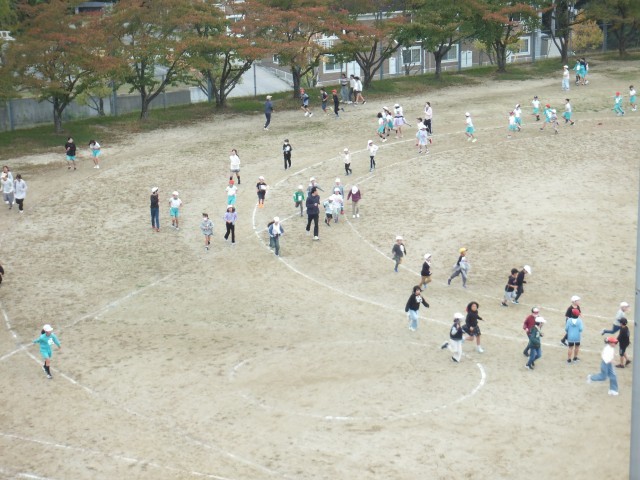先週から始まった全校児童のマラソン練習が始まりました。5分間、自分のペースで走っています。