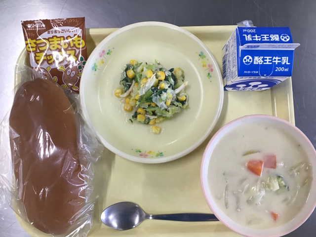 黒糖パン、牛乳、アサリ入りホワイトシチュー、チキンサラダ、さつまいもチップス