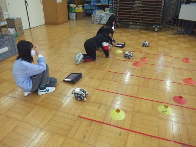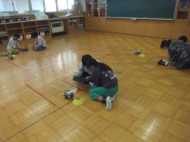 総合の時間、ロボット型教材を使って、前進したり、曲がったりするプログラムを作りました。さまざまなコースを走らせることに挑戦する姿が見られました。
