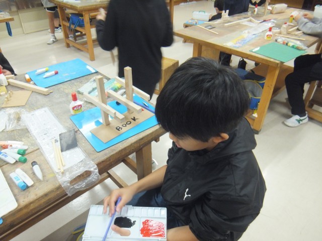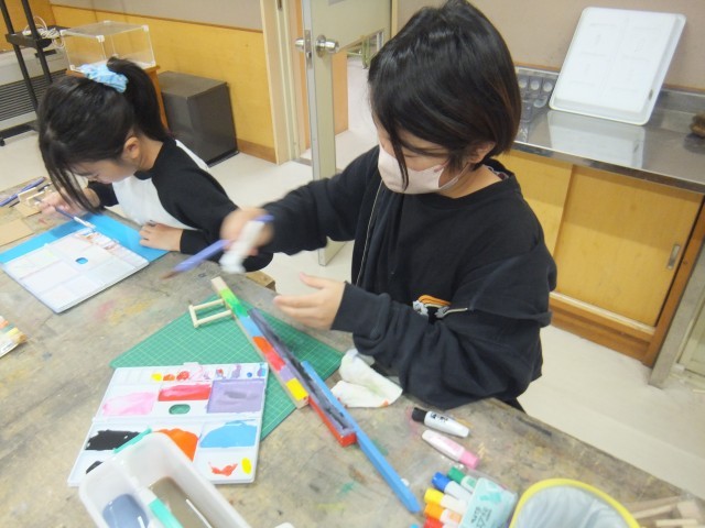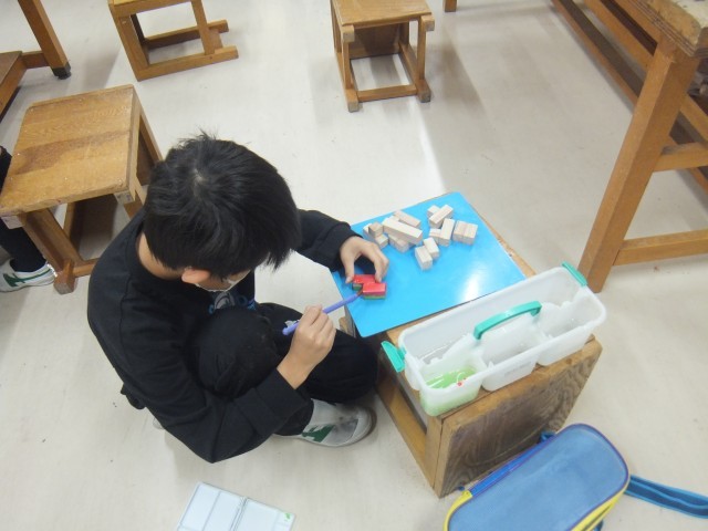 図工の時間、のこぎりで切った木材を組み合わせたり、絵の具で色を塗ったりしました。集中して取り組む姿が見られました。