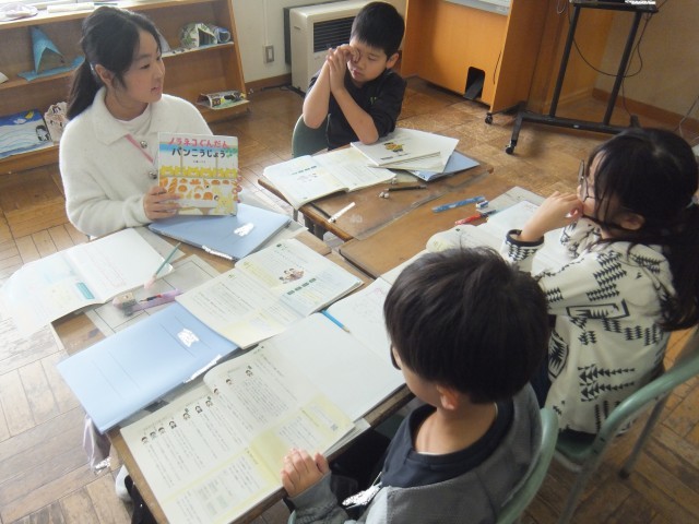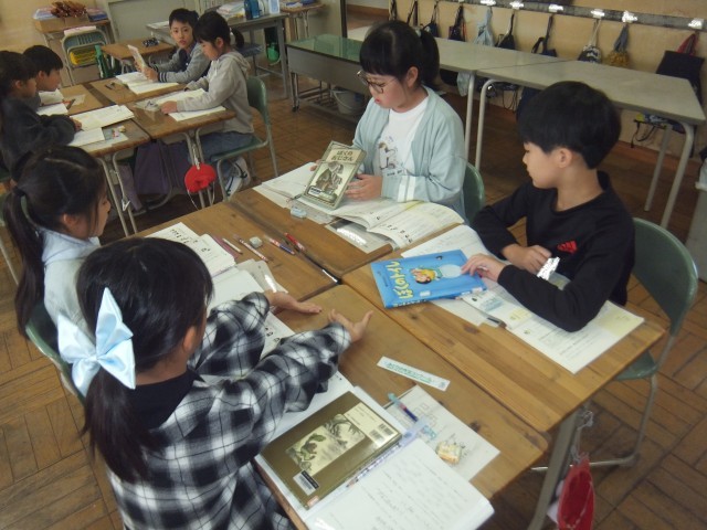 国語の時間、1年生が本をすきになってくれるような、楽しい本を紹介することを目的にして、グループで司会や記録など役割を決めて話し合いました。一人ひとりが図書室からおすすめの本を借り、どうして、その本がおすすめなのかを伝えあいました。友だちの話を真剣に聞く姿が見られました。