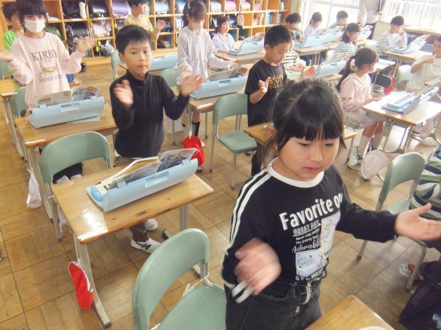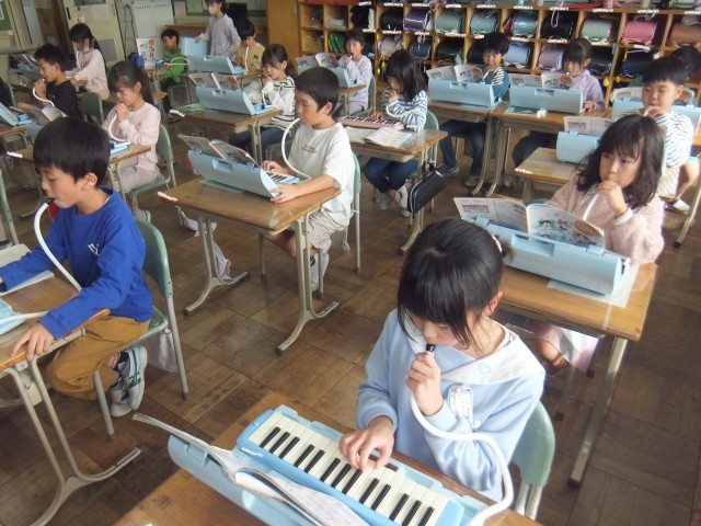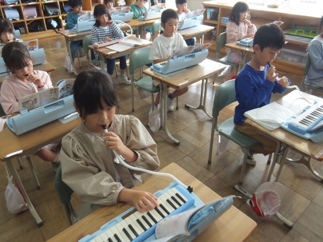 音楽の時間、『山のポルカ』の曲を鍵盤ハーモニカで演奏する練習をしました。ミの鍵盤に親指を置いたり、もう少し右にずらして、ソの鍵盤に親指を置いたりしながら演奏する方法を覚えました。また、2拍子、3拍子のリズムを打つ練習もしました。それから、鍵盤ハーモニカとリズムに分かれて、合奏の練習もしました。
