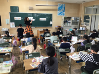 音楽の時間、ラップランド民謡である『アチャ パチャ ノチャ』の曲を階名で歌ったり、リコーダーで演奏したりしました。また、となり合った同じ高さの音符をつなぎ、1つの音にする『タイ』という記号も覚えました。