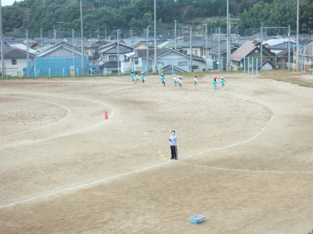 体育の時間、持久走記録会の練習をしました。コースを確認したり、自分の目標をもって走ったりしました。