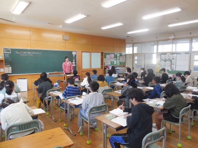 5年生は,算数科の学習「分数と小数」の学習で,分数を小数に直したり,小数を分数に直したりしながら,その関係を考えていました。