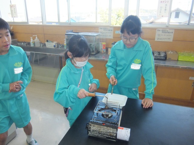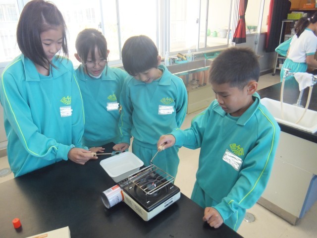 理科の時間、空気や水を温めると体積が大きくなり、冷やすと体積は小さくなることが分かりました。そこで、金属についても同様に調べました。はじめに、空気や水のようにお湯に入れて温めましたが、あまり変化は見られませんでした。そこで、「もっと温度を上げたほうがいい!」「火を使っては、どうかな。」という話し合いの後、ガスコンロで熱しました。熱すると、今まで通っていた輪に通らなくなり、ほんの少し体積が大きくなることが分かりました。