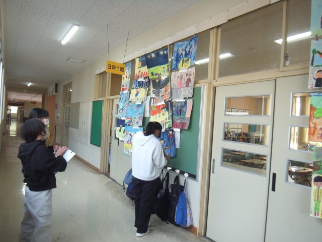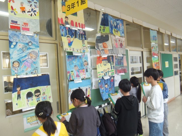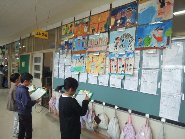 本校では、全校児童の絵画作品を廊下に貼り、『みどりっこ美術館』を行っています。各学年、図画工作科の時間や休み時間、昼休み等に、みどりっこ美術館の鑑賞を行っています。鑑賞カードに、作品のよいところをメモする姿が見られました。