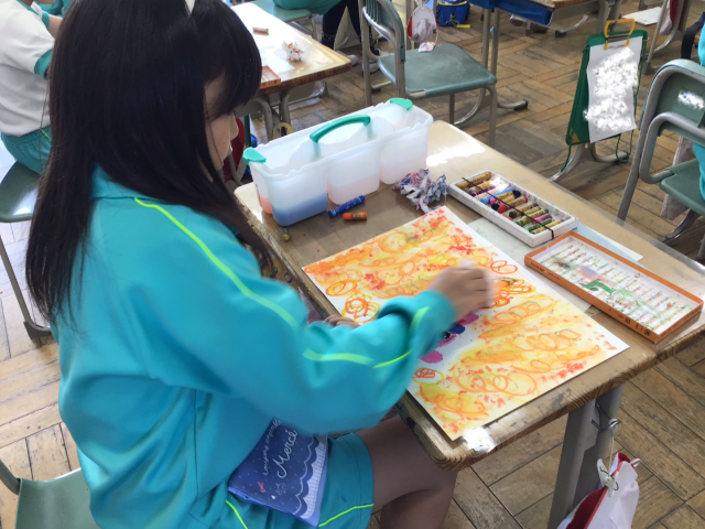 図工の時間、今まで読んだ本の中から、自分がお気に入りの言葉や心に残った言葉を選びました。その言葉からイメージを膨らませました。絵の具やクレヨン等を用いて、自分の思いや気持ちを画用紙いっぱいに表現することができました。