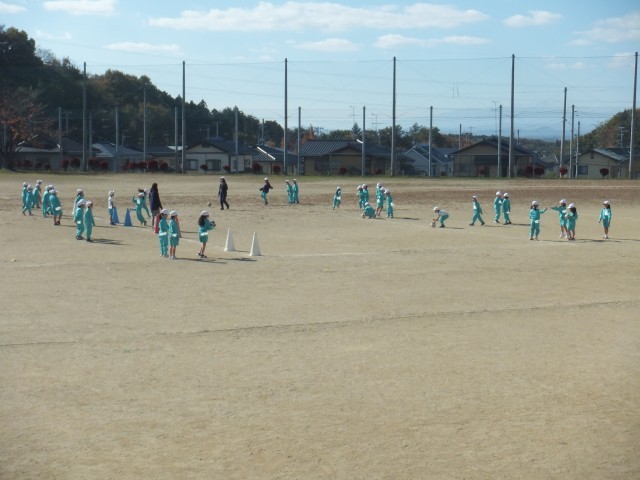 体育の時間、サッカーを使って、ボール蹴り遊びをしました。相手をよく見て、相手の足元にいくように、まっすぐ蹴っていました。友だちを励ましたり、認めたりする姿が見られました。