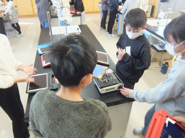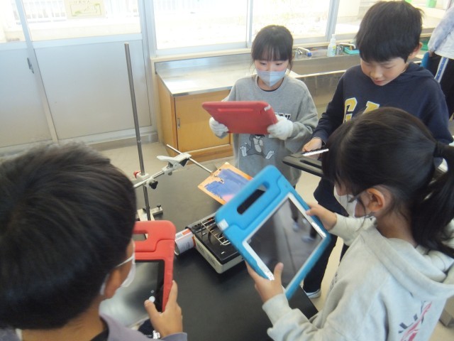 理科の時間、金属のあたたまり方を調べています。ガスコンロの正しい使い方を覚え、金属の棒や板をあたためました。実験のときには、グループで分担したり、結果を写真に撮って記録したりしました。また、結果をもとに考察を話し合うことができるようになってきました。金属は熱したところから順にあたたまっていくこと、全体があたたまることが分かりました。今後、空気と水についても、あたたまり方を調べていきます。