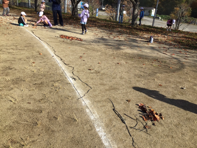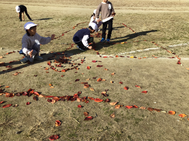 図工の時間、校庭に落ちている落ち葉を拾いました。友だちと協力しながら「こうしたらどうかな。」「ここから曲げるようにしよう!」など声を掛け合いながら落ち葉を並べることができました。