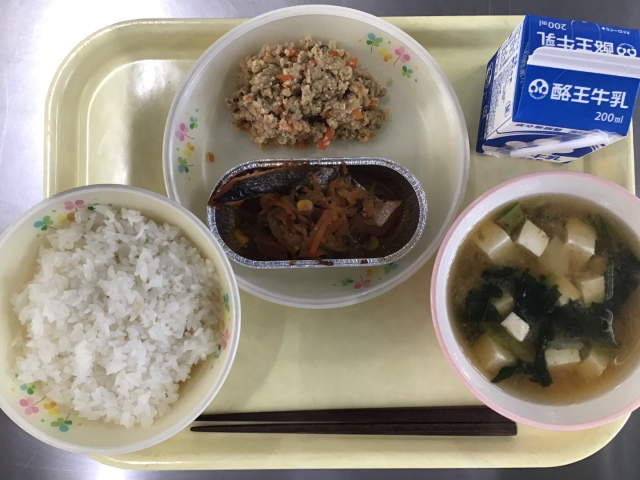 今日は『和食の日』献立です。「ごはん、牛乳、鮭のちゃんちゃん焼き、卯の花炒り、じゃがいもと小松菜のみそ汁
