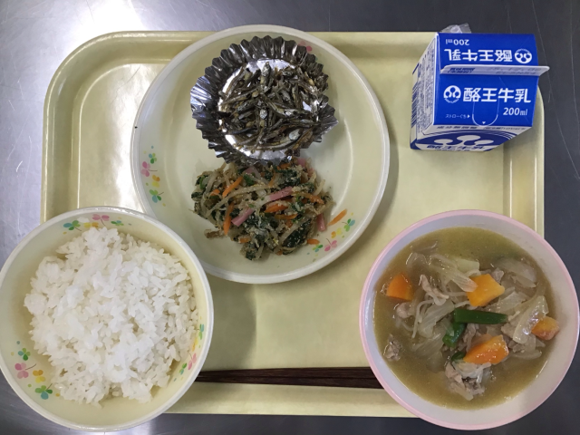 ごはん、牛乳、肉じゃが、青のり小魚、ゴマ和え