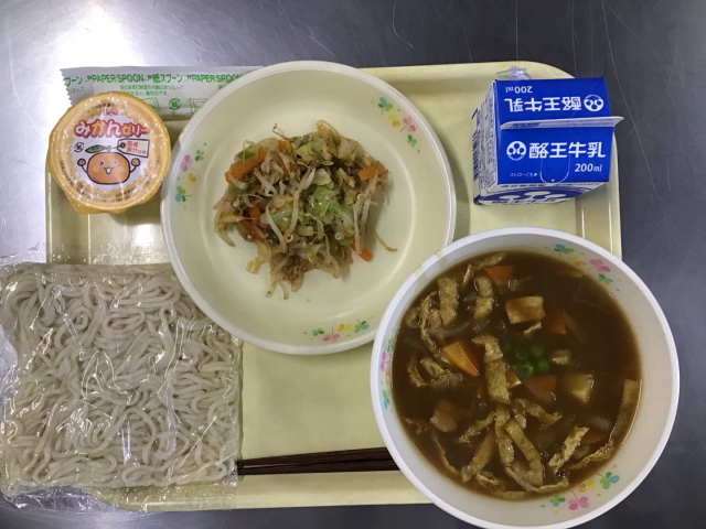 カレーうどん、牛乳、おかか和え、国産みかんゼリー