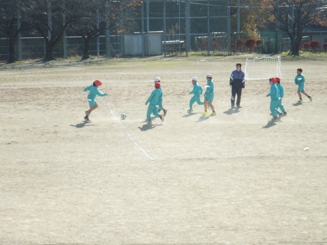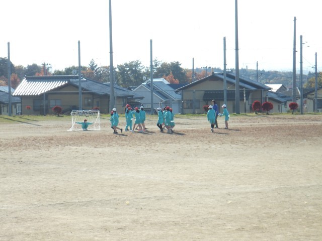 体育の時間、2つのコートを設置して、ミニサッカーゲームをしました。ゴールをめざして、いっしょうけんめい走ることができました。チームごとに声を掛け合ったり、認め合ったりする姿が見られました。