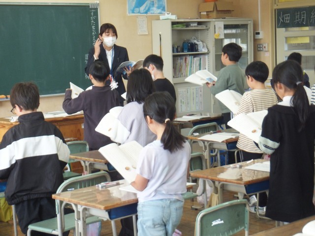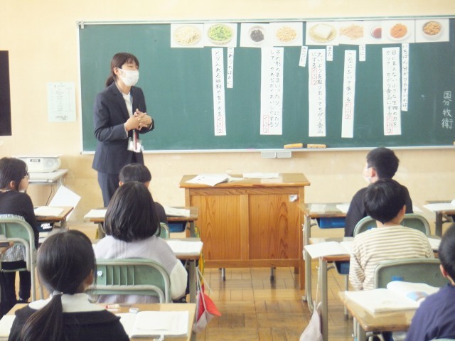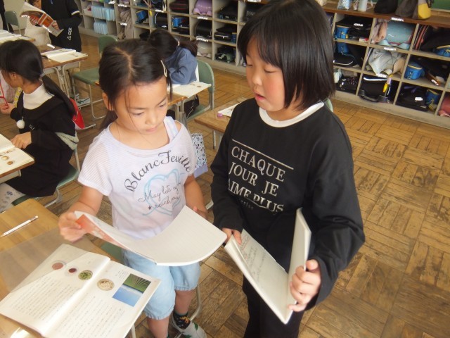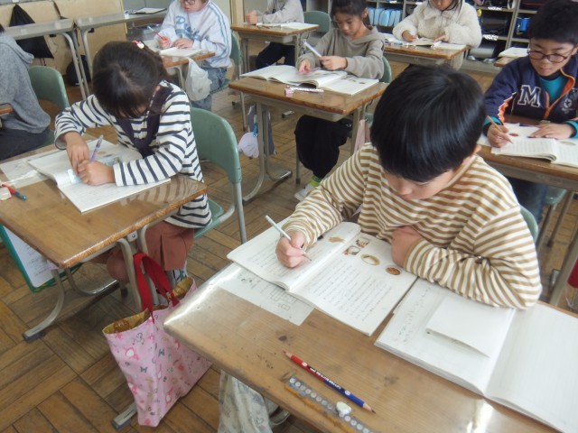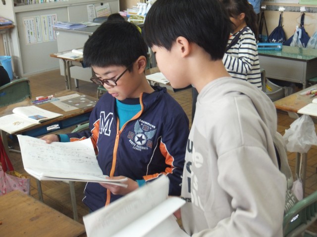 国語の時間、筆者のどのような思いから事例の順序で書かれているのかを考えました。「大豆の形かな。」「時間に関係してるかも。」「簡単に作ることができる順番かな。これは、おうちでぼくも作れそうだけど、こっちはおうちでは作れないよ。」など、自分の考えを書き、友だちに伝える姿が見られました。筆者の意図した順番について分かったので、次回、自分で食べ物のひみつを書くときにいかしたいと思います。