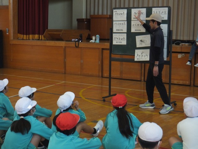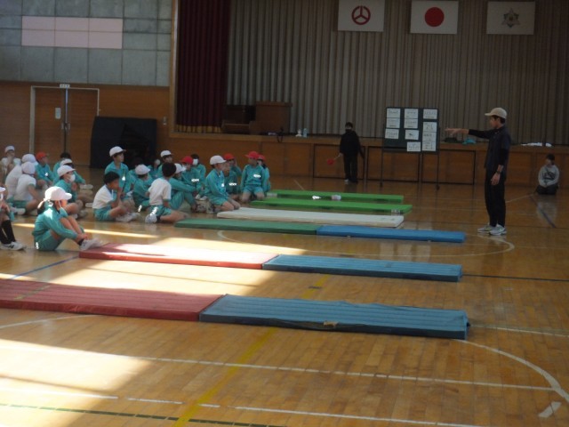 体育の時間、マット運動に取り組んでいます。自分の目標を決めて、開脚前転や飛込前転、壁倒立、倒立ブリッジなどの中から3つを選んで練習しました。友だちと声を掛け合ったり、教え合ったりする姿が見られました。