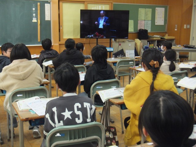 音楽の時間、ブラームス作曲『ハンガリー舞曲第5番』を鑑賞しました。速さ、強さ、旋律の繰り返しや変化、短調と長調の違いなどに注目しながら聴きました。また、指揮者の映像を参考にしながら、2拍子の指揮をまねすることもできました。