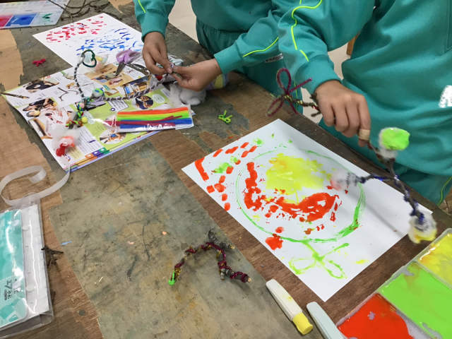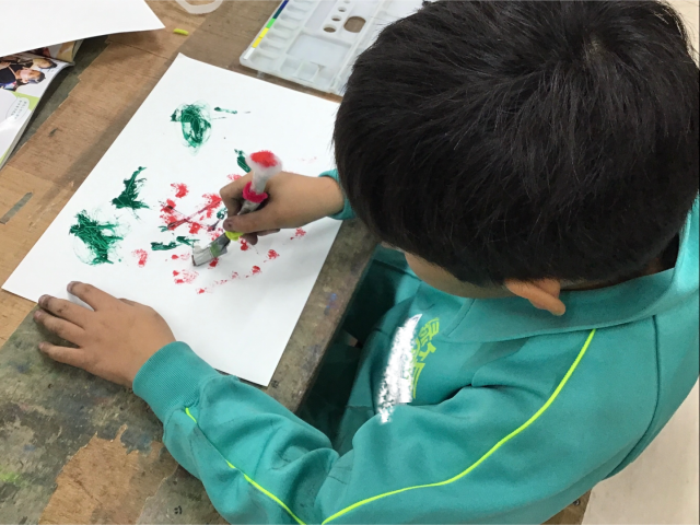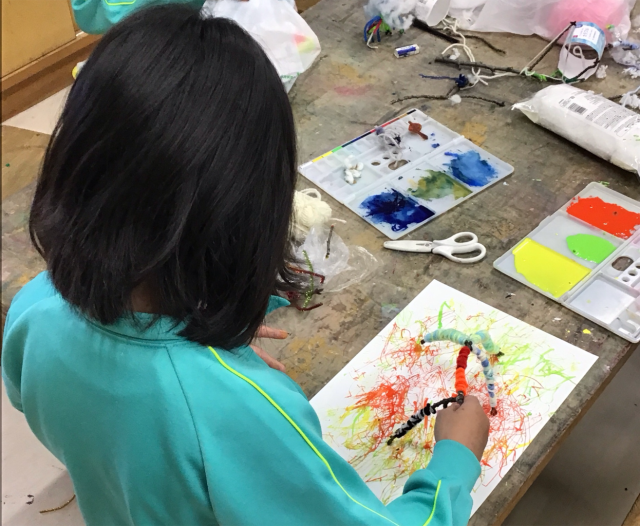 図工の時間、学校用務員さんからいただいた木の枝を使い、自分だけの筆やペンを作りました。ご家庭で準備した毛糸やひも、リボン、綿などを巻いたり、付けたりしました。また、小刀の正しい使い方を知り、小刀を使って削ることもできました。最後には、できあがった自分の筆で、いつもとは違ったダイナミックな絵を描くことができました。