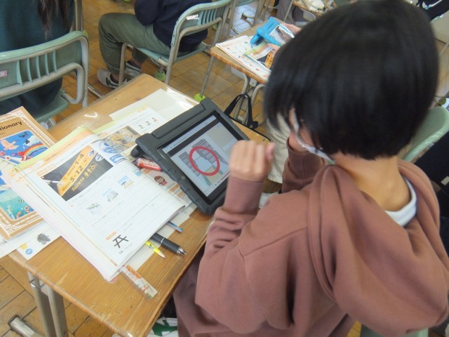 外国語の時間、世界の標識について考えました。海外の標識の写真を見て、その標識がどんな場所にあるかを考えたり、その標識から分かったことを書いたりしました。また、海外で使われている地図記号についても調べました。最後には、教科書に載っている「Word  Quiz」に一人ずつ取り組みました。