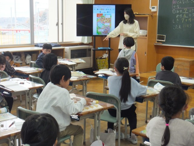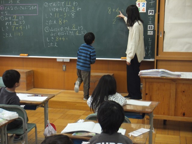 算数の時間、教科書のイラストを見て、どんな場面かを話し合いました。問題を読み、不足している数を考えました。問題文を完成させてから立式して、答えを求めることができました。ポイントになる言葉「みんなで」「どちらがおおい」などに着目して立式をする姿も見られました。