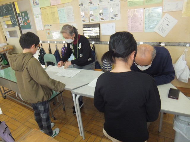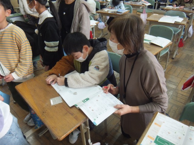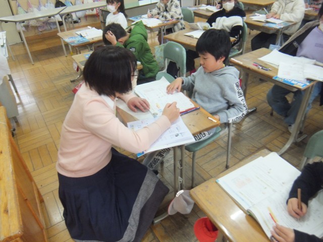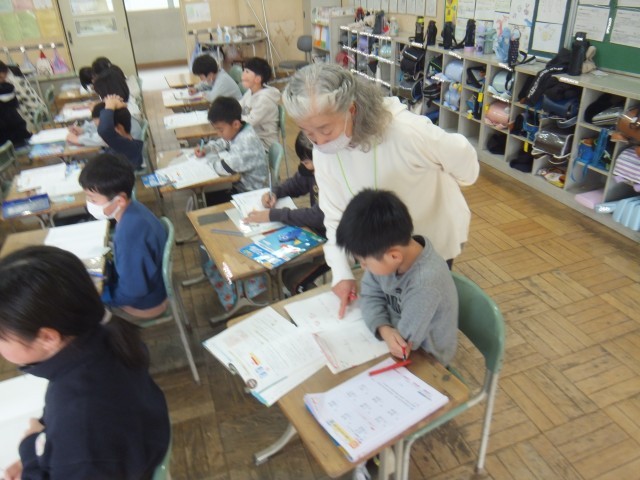 算数の時間、小数のたし算とひき算の練習問題に取り組みました。一人ひとりが自分のペースで確実に進めていきました。みどりっこサポーターの方々が分かりやすく教えてくれたり、丸付けをしてくれたりしました。隣で優しく教えていただき、いつもありがとうございます。