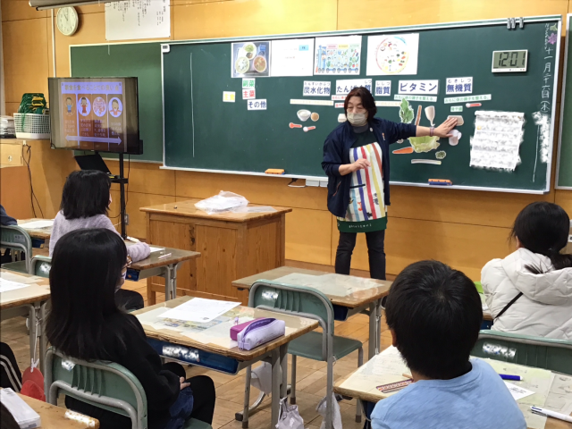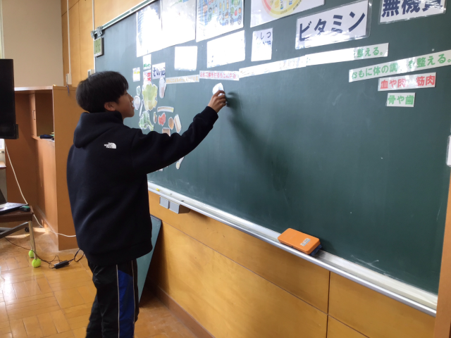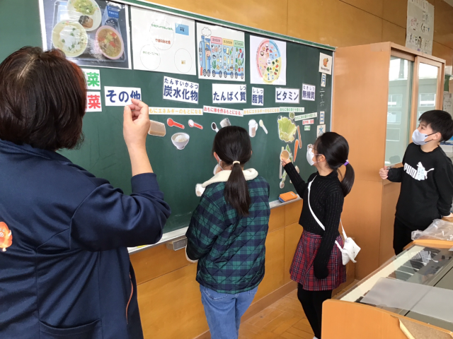学校栄養技師の先生が食育教育「朝食の大切さと栄養素」について話をしてくれました。はじめに、朝食を食べることのよい点を考えました。それから、五大栄養素である炭水化物、脂質、無機質、たんぱく質、ビタミンのはたらきを確認し、さまざまな食品を栄養素に分けました。最後に、これからの食生活について、「五大栄養素を朝食に取り入れたい。」「五大栄養素をバランスよく食べていきたい。」「好き嫌いしないようにして、栄養を取り入れられるようにしたい。」と、自分の思いや考えをプリントに書くことができました。