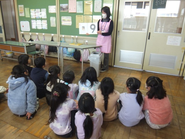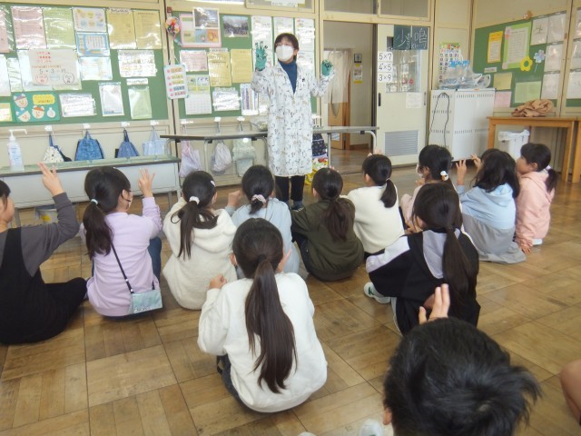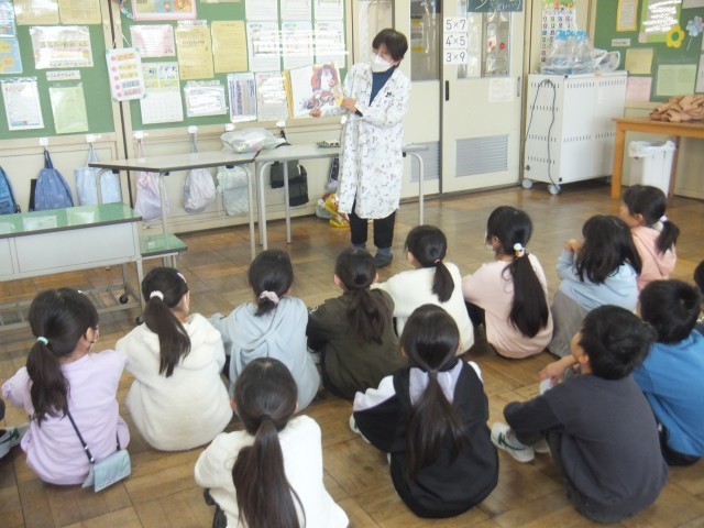 2年生の読み聞かせでした。「絵本の窓」の方々が手遊び歌をしてくれたり、パタパタポンという昔ながらの遊び道具を見せてくれたりしました。今回の本は、参加型の読み聞かせで、話を聞きながら熱心にこたえる姿が見られました。