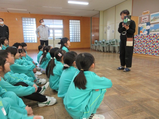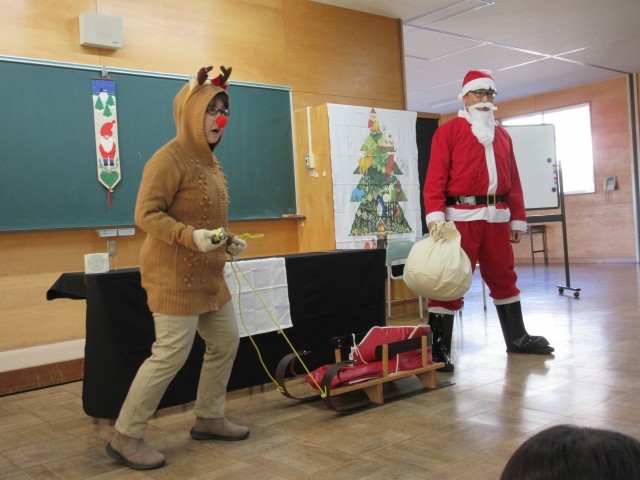 今年も『絵本の窓』の方々による「クリスマス読み聞かせ」がありました。ハンドベルの演奏を聴いたり、大型絵本の読み聞かせをしてもらったりしました。しかけ絵本を見せてもらい、とても驚いていました。サンタさんとトナカイさんも来てくれて、クリスマスプレゼントももらいました。今年もすてきなクリスマスを体験させてくれて、ありがとうございました。