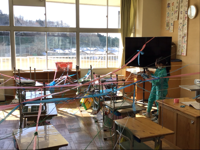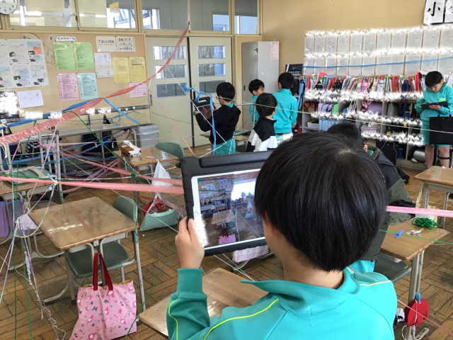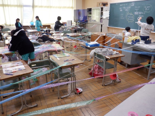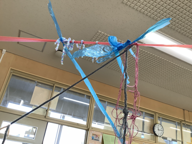 図工の時間、さまざまなひもをつないで、教室の中をすてきな空間に変化させました。友だち同士で一緒に考えたり、組み合わせたりする姿が見られました。色の組み合わせを工夫したり、下から見た感じを味わったりすることもできました。